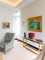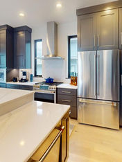 The kitchen invites cozy gatherings with its built-in banquette seating. In the great room, a soaring 19-foot ceiling draws your gaze upward, while expansive window walls flood the space with natural light. A quartz fireplace surround and wood accents add a touch of modern elegance, completing the awe-inspiring first floor.