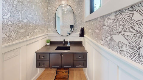 The stunning exterior showcases white oak timber, stone accents and carriage-style garage doors complemented by Abyss Black LP SmartSide horizontal and board-and-batten siding. Warm wood tones and black accents continue throughout the home’s interior.