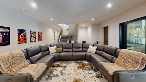 The lower level offers plenty of space to relax with a large family room, two bedrooms, a bunk room, a home gym and a spa room with a sauna. The four-seasons room with a bar opens with patio doors to the concrete patio spaces and pool. Stairs go from the lower level to an oversized three-car garage.