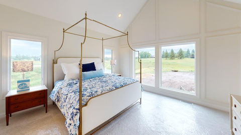 A master bedroom that boasts a large walk-in closet and a private bathroom